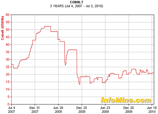 The chart shows cobalt falling like a stone – down 73% from the May 2008 peak to the December 2008 bottom. Since then the price recovery has been modest.