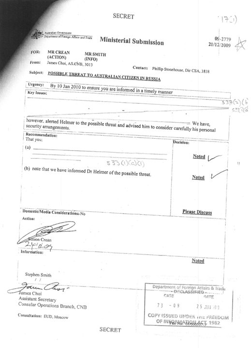 Secret Australian government documents, including intelligence reports, cables to and from the Australian Embassy in Moscow, and memoranda involving the highest officials in Crean’s ministry have now been released. These confirm that intelligence sources had uncovered the information of the security threat at least a week before the warning was sent to Helmer.