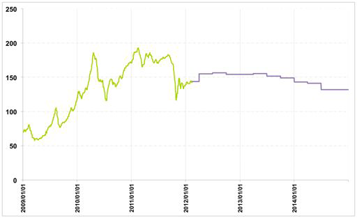 In a presentation to investors released this week, BCI isn’t optimistic itself. This chart shows the company forecasting an iron-ore price (the benchmark is iron-ore of 62% Fe content delivered at Tianjin port) edging below the $150 per tonne level through 2014; thereafter, the BCI management is anticipating a further drop for iron-ore below the $100 per tonne mark: