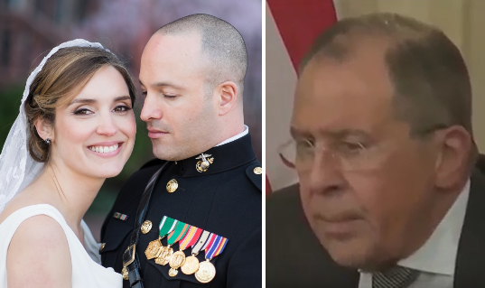 The last question asked in the session was directed at Foreign Minister Sergei Lavrov from a Columbia Broadcasting System correspondent, Margaret Brennan (pictured below, left, with her Marine Corps husband, Major Ali Iyad Yakub, who is of Syrian origin). At minute 48:14 Brennan said: “President Trump has called Bashar al-Assad an animal. This is the leader your government continues to back. Can you tell us how long Russia will be willing to risk the lives of its soldiers and spend its money to protect him?”