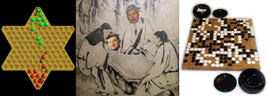 Wei Chi, on the other hand — also known as Go, in Japan — is said to have been created by the Emperor Shun around 2200 BC, to train the brains of his son and heir. The game has evolved such complex strategy over the board space that a novice cannot readily understand how his space has been surrounded without apparent capture; and in the champion games, who has won and how.