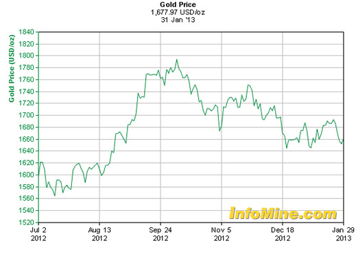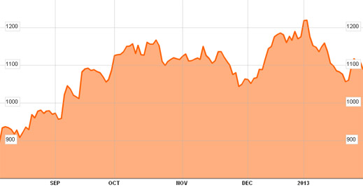 Over the same six-month period, the price of gold has been heading in the opposite direction, downwards by 6.3%. The FTSE index for London listed shares is up 14.3% over the interval.