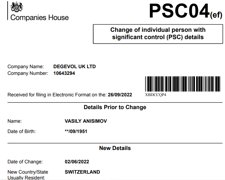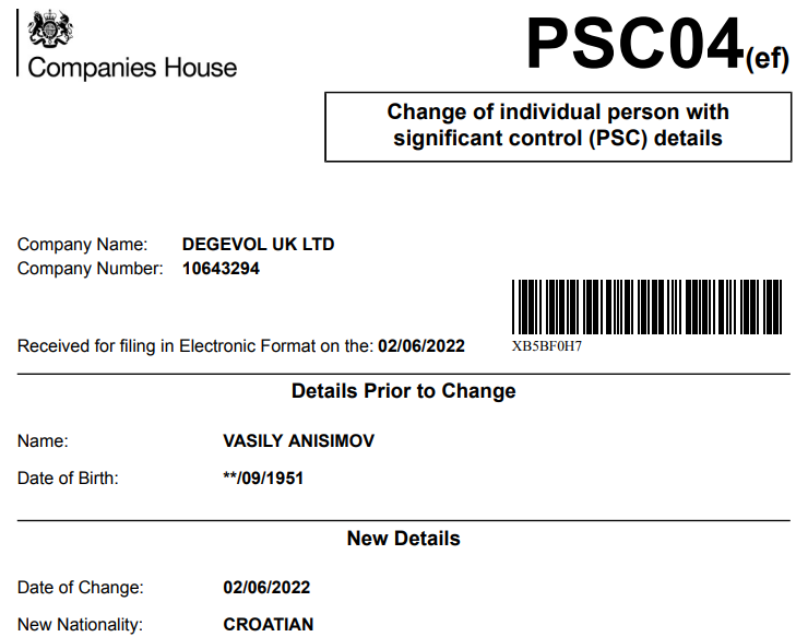 When Anisimov first established Degelov UK, he reported to the UK Companies House that he was a Russian citizen living in Russia. That was on February 28, 2017.