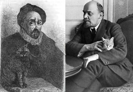 In Russian history, as well as in the Soviet period, few affinities have been recorded between the tsars, the commissars and their cats, except for Lenin. The photo archives suggest there were two, perhaps more cats at his Gorky residence, the grey-striped, short-haired European tabby shown in the illustration, and also a black and white one. Significantly too, from the Montaigne perspective, Lenin was happy to be photographed with his cat. Vladimir Putin is similar, though he prefers dogs as pets.