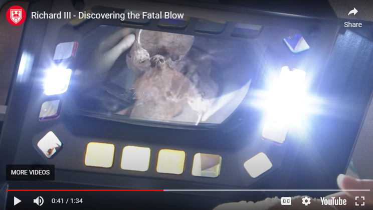 Video film clip of Dr Guy Rutty’s examination of the skull of King Richard III to identify the cause of his death; the film was released publicly by the University of Leicester. “’I approached this examination as that of any patient – just because he was a King did not make a difference,’ said Professor Rutty. ‘Everyone is treated the same with the same doctor/patient relationship, the same respect in death and the same level of professional investigation. The key to this sequence is that alongside my role at the University of Leicester, I am a Home office forensic pathologist. Thus I was able to look at the large injury in the base of the skull and, through experience, I was able to identify the key injury’.” Rutty’s analysis recorded here avoids the 500-year controversy over whether Richard’s wounds show that he had been fatally wounded in combat or executed after he had been disarmed -- “piteously slain and murdered” as was claimed at the time by his supporters, and denied by the Tudor dynasty and its successors ever since.