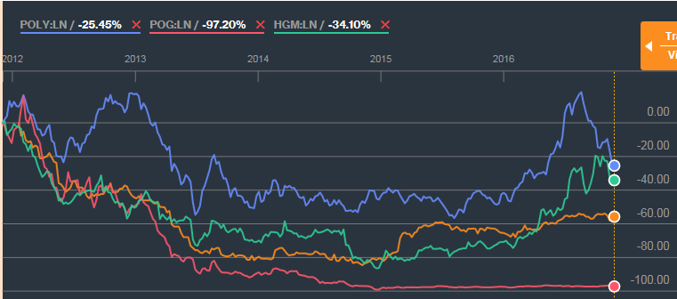 KEY: blue=Polymetal (-26%; yellow=Nordgold (-56%); pink=Petropavlovsk (-97%); Highland Gold (-34%)