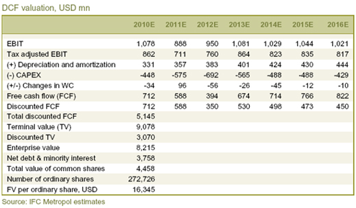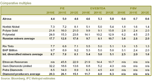 But Metropol’s enthusiasm was tempered. Its projection of Alrosa’s earnings shows declines for 2011 and 2012, and no improvement above the 2010 level before 2017 at the earliest. When the company’s capital spending requirements for its costly, risky underground mines are added to the calculation, this table looks tilted negatively for the post-IPO share price: