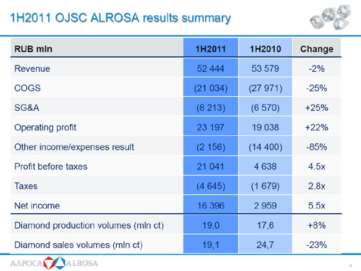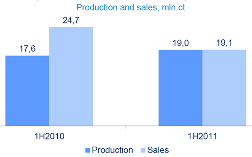 The company explains that a year ago, it sold more stones at a lower diamond price, including inventory of diamonds which had been stockpiled in late 2008 and through 2009, during the global crash in diamond demand. So sale revenues in the first half of 2010 turned out to be Rb53.6 billion (equivalent to $1.76 billion, according to the Central Bank average exchange rate for the period). This year, sale revenues have come to Rb52.4 billion, a decline of 2% in rouble terms. Alrosa doesn’t publish its conversion rate for the latest six-month period, but it is bound to be about Rb29 to the US dollar. That makes the first-half sale revenues equivalent to $1.81 billion – up 3%.