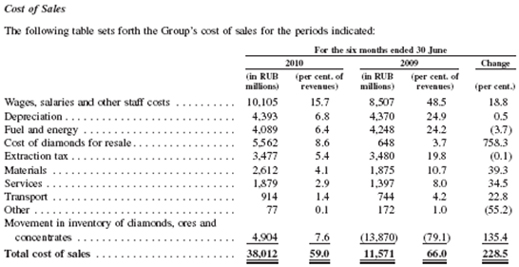Here is the last published account by Alrosa of its principal costs, prepared in a prospectus written by JP Morgan, UBS and VTB Capital for the issue of $1 billion in debt notes in October of 2010. The table suggests that because wages, salaries and staff costs comprise by far the biggest share of Alrosa’s cost line, the dramatic cost savings this year may be due to wage or pension cuts.