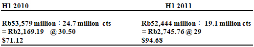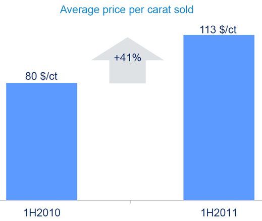 Andreyev was also asked to explain another of this week’s performance indicators. In line with rising diamond prices recorded worldwide, Alrosa reports that in the first half it averaged $113 per carat sold. According to this chart, that compares very favourably with $80 per carat in the same period of 2010.