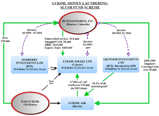 The ADC submission pinpoints the Colorado engineering company DSE as a lynchpin for managing oilfield engineers working on LUKoil’s fields in Russia, and allegedly for running cash in and out of the US and Russia. “DS Engineering had no clients other than Lukoil companies from 1999 through early 2008. Each month, DS Engineering charged for Lukoil Colorado Employees’ daily rates and travel expenses for work in Russia, and the Colorado Office’s monthly operating expenses … DS Engineering even charged for office chairs, Christmas parties, flowers, and holiday cards. DS Engineering was nothing more than a ‘pass through’ entity serving as a de facto Lukoil office in Colorado… From March 1999 … Lukoil Colorado Employees … were effectively full time employees … even though DS Engineering apparently treated them as independent contractors in apparent violation of Colorado and federal law … Lukoil has continuously employed and paid up to 25 Lukoil Colorado Employees per month from March 1999 …The Lukoil Colorado Employees were appointed to positions of authority within the Lukoil companies in Russia; for example, [Dean Sillerud] … served as the “First Deputy General Director” of Lukoil AIK … for many years … numerous other DS Engineering personnel served as “Chief Engineer” of Lukoil AIK and other Lukoil companies…From March 1999 … Lukoil used DS Engineering as the fulcrum of illegal cash smuggling schemes … in which the Lukoil Colorado Employees carried cash from Colorado to Russia, in amounts averaging $40,000 per month, totaling over $6 million….The cash smuggled each month was purposefully broken up into bundles of less than $10,000 and divided among separate Lukoil Colorado Employees travelling to Russia to knowingly avoid U.S. currency reporting laws.”