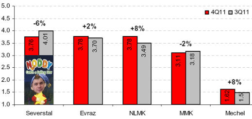 That is drawing an unusual degree of scepticism. According to the usually ebullient steel analyst at Renaissance Capital, Boris Krasnojenov, “we believe disappointing 4Q11/1Q12 results may be a common theme for all Russian steel majors.” According to Ehrlich, “although Severstal claims it has successfully sold the volumes into 1Q12, we have no grounds to confirm or deny this statement.”
