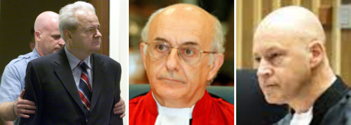 Left: Dutch guard holds Yugoslav President Slobodan Milosevic at his ICTY trial in The Hague, February 2002; centre, the Italian chief judge of the ICTY, Antonio Cassese; right, District Court judge Hendrik Steenhuis.