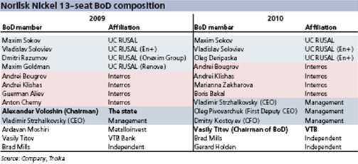 Troika Dialog issued this table showing how the shareholder voting has changed the Norilsk Nickel board: