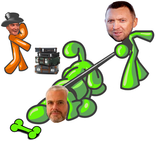 Blair’s political ally, Lord Peter Mandelson (image, left rear), lost his last public office when the Labor Party was defeated in the UK election of May 2010. He then started a publicly registered private business called Global Counsel LLP in November 2010. Investment and operating infrastructure, including London offices, for Mandelson’s Global Counsel come from WPP, one of the world’s largest public relations and advertising conglomerates. WPP owns London PR firms like Finsbury, whose past and current clientele includes Nathaniel Rothschild and Oleg Deripaska (image, right), Rothschild’s investment vehicles Atticus and Vallar, and Deripaska’s Rusal and Basic Element. The non-executive chairman of WPP, an American politico named Philip Lader, is a board director at Rusal.