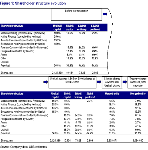 According to Russian law, the merger must be supported by 75% of all shareholders of Silvinit, including both common and preferred shares, which will be treated equally for voting purposes. UBS reports “we believe this might be a potential obstacle to the deal. In particular, 50.9% of the company’s capital is owned by a group of investors headed by Mr. Kerimov.”