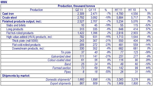 According to the latest MMK report, released today, cold-rolled steel output in the second quarter came to 209,000 tonnes, a production cut of 23% from the first quarter of this year. The first-half volume for this year was 481,000 tonnes, down 14% on the same period of 2010.
