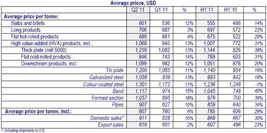 This shows that MMK’s financial performance and profitability are likely to have been improving in the second quarter, as it paid out less to produce less, but charged more for its sales. The table confirms that the average price per tonne reported for domestic sales jumped 10% on the quarter to $911/t; the export sales price grew by just 2% to $616/t. There was thus an enormous premium between the pricing of MMK’s steel sold at home, and the steel sold abroad. That premium – and the higher profit margin on domestic steel sold by Rashnikov — was what Russian steel consumers were complaining of bitterly at the start of this year.