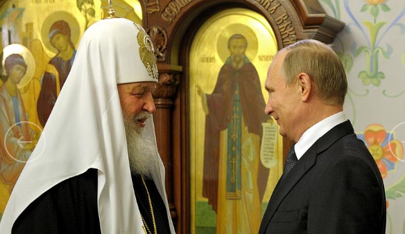 Patriarch Kirill and Putin meeting at the Kremlin on May 24, 2016. They also met together on February 1, 2016, when Putin told Kirill “a big thank you to you for developing the Russian Orthodox Church and for strengthening the unity of our people and society.” In 2013 Putin had told Kirill: :"The Russian Orthodox Church and other traditional religions should get every opportunity to fully serve in such important fields as the support of family and motherhood, the upbringing and education of children, youth, social development, and to strengthen the patriotic spirit of the armed forces." Source: http://www.reuters.com/article/us-russia-putin-church-idUSBRE91016F20130201