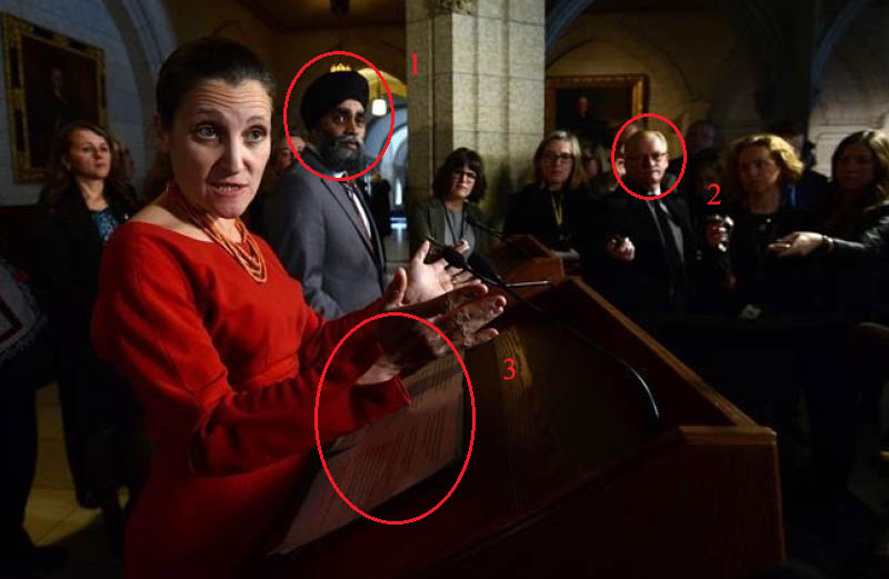 Above is a picture of the two ministers, as Freeland addresses a question from a reporter to her right, who is invisible to the camera. Sajjan (circle-1) is on Freeland’s left, his mouth shut. At the rear of the picture, in the centre of the row of reporters, the only male among them is Fife (circle-2). In front of Freeland, on the podium but screened from the reporters present, Freeland’s briefing book is visible (circle-3). The camera has picked up several script lines which Freeland and her staff had decided in advance that she would answer when asked.
