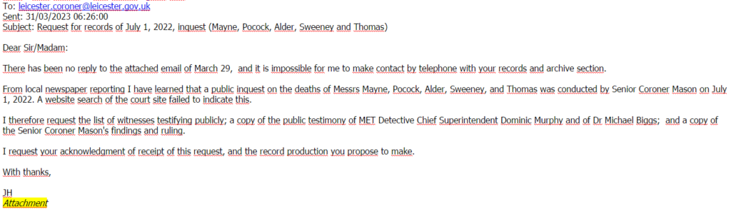 The reporter Biggs was referring to was Tom Mack. This is his report in the Leicester Mercury from the coroner’s court on July 1, 2022. Mack was asked four questions about what he had heard in court: