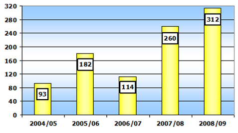Since the 2006 season, the volume of wheat flour exported has doubled, reaching 312,000 tonnes, according to the chart for 2008/2009. Adding other types of flour, the total exported in the 2008/2009 season came to 387,000 tonnes.