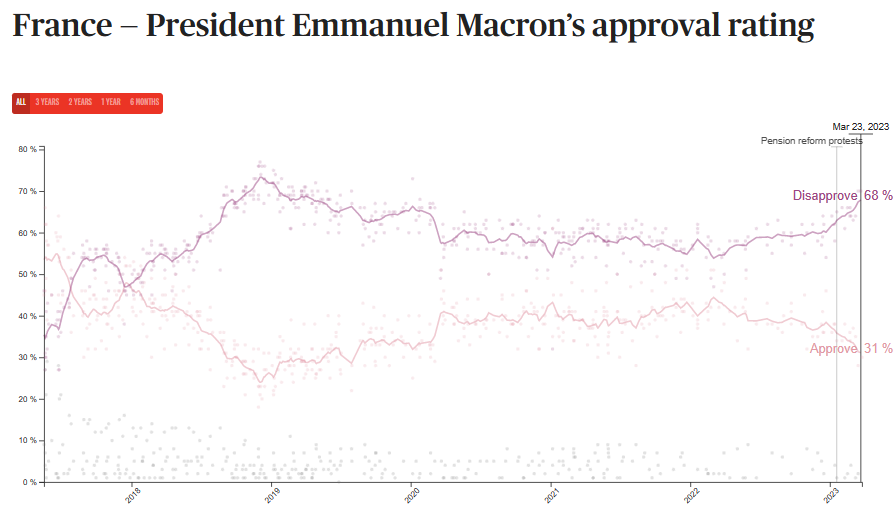What then is happening in France, where nationwide strikes, city protests and violent attacks on protesters by police and agents provocateurs have followed President Emmanuel Macron’s moves to impose rule by personal decree and ignore the National Assembly. One consequence is the rising French disapproval of Macron, erasing the 59% majority he won on his re-election in May, a year ago.