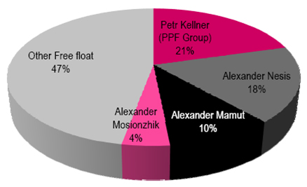 An analysis by Alfa Bank metals analyst Barry Ehrlich revises and clarifies these stake figures – prior to the transfer into Polymetal International, the Kellner stake was about 20%, the Nesis stake 17.2%, Mamut 9.7%, and Mosionzhik (see image), 4.3%. Their total came to 51.1%. The free float was 40.3%, leaving company-owned treasury shares amounting to 34.5 million in number, or 8.6% of the total issue.