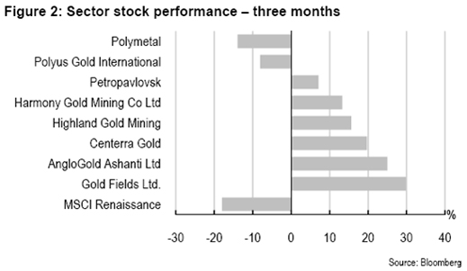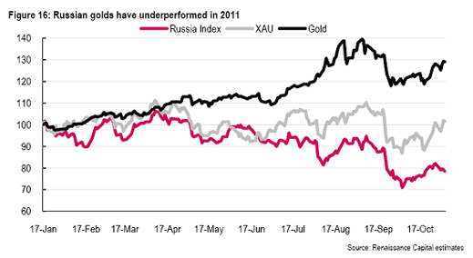 Two charts from Rencap illustrate how weakly the Russian goldminer share prices have been performing this year, especially Polymetal and Polyus Gold: